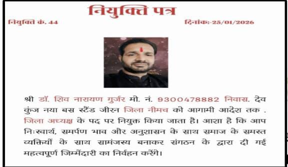 डाॅ. शिव नारायण गुर्जर पुनः नियुक्त, अखिल भारतीय गुर्जर देवसेना, नीमच के जिलाध्यक्ष....