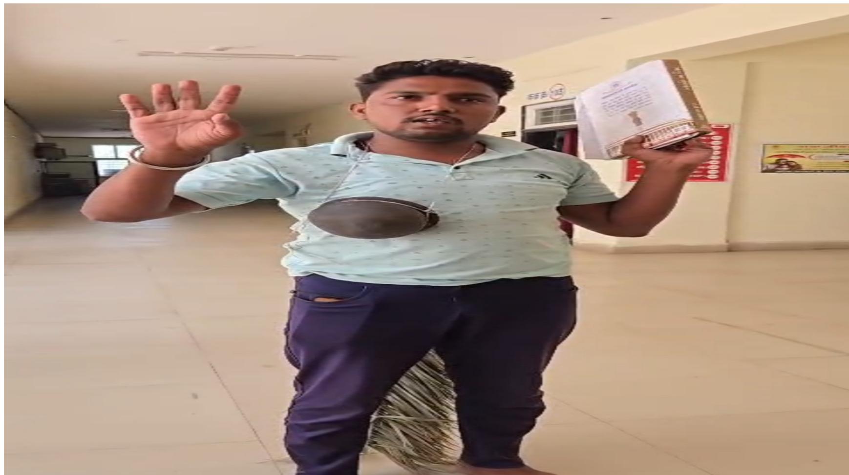 मंदसौर जनसुनवाई में युवक का अनोखा प्रदर्शन, संविधान हाथ में, गले में काली हांडी और शरीर पर झाड़ू बांधकर पहुंचा फरियादी....